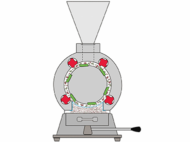 原理:物料經(jīng)喂料斗進(jìn)入粉碎室。喂料斗下方的插板可精確控制加料量。粉碎室內(nèi)壁上固定著四個(gè)特制的切刀,安裝在電動(dòng)機(jī)軸端的轉(zhuǎn)子上裝有六個(gè)可換可調(diào)的切刀,刀口方向與內(nèi)壁上的相反以便磨碎物料。調(diào)換粉碎室下部的篩網(wǎng)可以控制物料的粗細(xì)度。達(dá)到細(xì)度的物料落入收集盤中,篩上物繼續(xù)被粉碎直至達(dá)到所需細(xì)度。