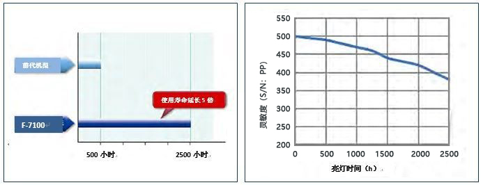 F-7100采用全新氙燈,并改良了燈電源,使得光源亮度提升,并有效延長(zhǎng)了氙燈的使用壽命。延長(zhǎng)燈泡更換周期可降低耗材成本,減輕燈泡更換等作業(yè)負(fù)擔(dān)(如上左圖)。由如上右圖可知,F(xiàn)-7100性能卓越,即使氙燈使用接近2500h,也能夠維持較高的靈敏度。