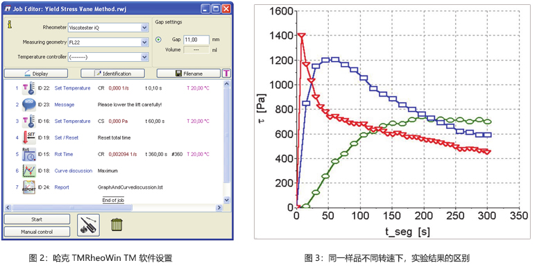 本文使用賽默飛 哈克Viscotester iQ智能流變儀配合 兩種4 葉片的槳葉式轉(zhuǎn)子(FL16 和 FL22)在通用夾持 器上通過控制速率模式進(jìn)行實(shí)驗(yàn),轉(zhuǎn)子葉片直徑分別為 16 和 22 毫米,高度分別為8.8 和 16 毫米(圖1),儀 器轉(zhuǎn)速設(shè)置為0.05rpm。5 中市售醬類產(chǎn)品分別使用不 同的轉(zhuǎn)子,采用相同的實(shí)驗(yàn)參數(shù)進(jìn)行測(cè)試。將產(chǎn)品容器 蓋子打開,直接放置在通用夾持器上面。利用手動(dòng)控制 升降功能和哈克 TMRheoWinTM 軟件設(shè)置(圖 2)以保證 轉(zhuǎn)子保持靜止,然后垂直的將轉(zhuǎn)子插入到具有高度重復(fù) 性的測(cè)量位置。實(shí)際經(jīng)驗(yàn)表明,較硬的產(chǎn)品在生產(chǎn)線上 以較高的速度罐裝時(shí),產(chǎn)品在容器內(nèi)的不同區(qū)域可能表 現(xiàn)出不一樣的性質(zhì)。因此每次實(shí)驗(yàn)都必須保證槳葉轉(zhuǎn)子 在產(chǎn)品容器中的位置是相同的,以確保測(cè)試結(jié)果的重復(fù) 性和可靠性。當(dāng)樣品經(jīng)過短暫的平衡和恢復(fù)后,測(cè)試時(shí) 間被重置為 0。然后設(shè)置一個(gè)非常低轉(zhuǎn)速(0.05rpm), 旋轉(zhuǎn)的時(shí)間以及在此時(shí)間段內(nèi)所需要的數(shù)據(jù)點(diǎn)的數(shù)量。 最后可以加入數(shù)據(jù)自動(dòng)評(píng)估的設(shè)置以及生成實(shí)驗(yàn)報(bào)告。 實(shí)驗(yàn)報(bào)告可以保存為多種格式(比如 pdf,jpeg,tiff 等) 或者直接由打印機(jī)輸出。對(duì)于每一類樣品,都需要進(jìn)行 簡(jiǎn)單的預(yù)實(shí)驗(yàn)來確定最合適的轉(zhuǎn)子型號(hào)。比如較小尺寸 的轉(zhuǎn)子適合測(cè)試具備較高屈服應(yīng)力的樣品,比如花生醬; 而尺寸大的轉(zhuǎn)子則適用于測(cè)試低粘度、低屈服應(yīng)力的樣 品,例如巧克力醬,果醬或者蛋黃醬 [7]。為了確定合適 的轉(zhuǎn)速,則需要進(jìn)行多種轉(zhuǎn)速的實(shí)驗(yàn)。轉(zhuǎn)速太高則會(huì)在 曲線上形成一個(gè)難以計(jì)算的尖峰(圖3中紅色三角形),轉(zhuǎn)速太低則會(huì)產(chǎn)生漸進(jìn)型的曲線(圖3 綠色圓圈)。而 我們的目的是選擇一個(gè)合適的轉(zhuǎn)速,使得實(shí)驗(yàn)曲線具有 一個(gè)可以評(píng)估的最大值(圖3 藍(lán)色長(zhǎng)方形)。前期實(shí)驗(yàn) 證明,0.05rpm 的轉(zhuǎn)速是最適合這些樣品的。
