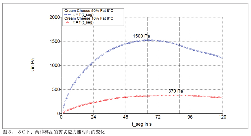 彈性響應(yīng)后,其結(jié)構(gòu)遭到破壞并且剪切應(yīng)力開(kāi)始下降。實(shí)驗(yàn)結(jié)果中剪切應(yīng)力在整個(gè)測(cè)試時(shí)間內(nèi)的最大值就對(duì)應(yīng)了樣品的屈服應(yīng)力。圖 2 是兩種樣品在室溫下的測(cè)試結(jié)果,可以看出,脂肪含量高的樣品的屈服應(yīng)力為 1000Pa,而低脂肪含量樣品的屈服應(yīng)力則為210Pa。而圖 3 則是兩種樣品在較低溫度下(8℃)的結(jié)果,相當(dāng)于樣品剛從冰箱內(nèi)取出的溫度。其結(jié)果表明高、低脂肪含量的樣品在此溫度下的屈服應(yīng)力都有所上升,分別為 1500Pa 和 370Pa。結(jié)合上述結(jié)果,當(dāng)考慮將此類食品涂抹在某些剪切模量低至1200Pa 白面包上時(shí)就會(huì)出現(xiàn)問(wèn)題,因?yàn)樵诶洳貤l件下的奶油奶酪的屈服應(yīng)力遠(yuǎn)大于面包所能承受的剪切模量。