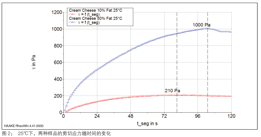 圖 1 是賽默飛哈克 Viscotester iQ 智能流變儀配備槳葉式夾具配置圖。實(shí)驗(yàn)測(cè)試了兩種不同脂肪含量(10% 和 50%)的奶油奶酪樣品再不同溫度下(25℃和 8℃)的流變性能。