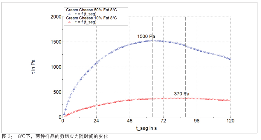 當(dāng)槳葉式轉(zhuǎn)子完全浸沒在樣品后,設(shè)定轉(zhuǎn)速參數(shù)為 0.05rpm 進(jìn)行測(cè)試,然后觀察剪切應(yīng)力隨時(shí)間的變化趨勢(shì)。在樣品發(fā)生初期彈性響應(yīng)后,其結(jié)構(gòu)遭到破壞并且剪切應(yīng)力開始下降。實(shí)驗(yàn)結(jié)果中剪切應(yīng)力在整個(gè)測(cè)試時(shí)間內(nèi)的最大值就對(duì)應(yīng)了樣品的屈服應(yīng)力。圖 2 是兩種樣品在室溫下的測(cè)試結(jié)果,可以看出,脂肪含量高的樣品的屈服應(yīng)力為 1000Pa,而低脂肪含量樣品的屈服應(yīng)力則為210Pa。而圖 3 則是兩種樣品在較低溫度下(8℃)的結(jié)果,相當(dāng)于樣品剛從冰箱內(nèi)取出的溫度。其結(jié)果表明高、低脂肪含量的樣品在此溫度下的屈服應(yīng)力都有所上升,分別為 1500Pa 和 370Pa。結(jié)合上述結(jié)果,當(dāng)考慮將此類食品涂抹在某些剪切模量低至1200Pa 白面包上時(shí)就會(huì)出現(xiàn)問題,因?yàn)樵诶洳貤l件下的奶油奶酪的屈服應(yīng)力遠(yuǎn)大于面包所能承受的剪切模量。