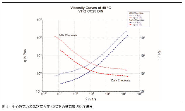 當(dāng)圓筒轉(zhuǎn)子的上部到達(dá)測(cè)量位置后,樣品保持一個(gè) 靜止的狀態(tài)。在這個(gè)時(shí)間里,任何由于加樣或者或 者夾具閉合帶來(lái)的外力作用都會(huì)得到松弛,同時(shí)樣 品也會(huì)到達(dá)測(cè)試溫度。程序的最后(步驟11-13) 是數(shù)據(jù)評(píng)估部分,由RheoWinTM 軟件自動(dòng)進(jìn)行。 通過(guò)傳統(tǒng)的卡松模型或者Windhab 模型[3] 可以來(lái) 計(jì)算巧克力融體的屈服應(yīng)力. 而 Servais [4] 提供了 一個(gè)更為簡(jiǎn)便的方法,就是用剪切速率為5s-1 下 的剪切應(yīng)力作為其屈服應(yīng)力。如果采用這種方法, RheoWinTM 軟件也可以自動(dòng)進(jìn)行插值計(jì)算。 同樣,本報(bào)告中也給出了兩種樣品在 40℃下的穩(wěn)態(tài) 剪切實(shí)驗(yàn)結(jié)果。相對(duì)于瞬時(shí)粘度數(shù)據(jù),穩(wěn)態(tài)剪切粘 度不取決于時(shí)間依賴(lài)效應(yīng)或者剪切速率變化斜率。
