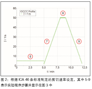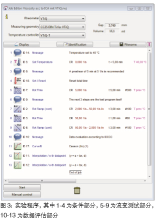按照 ICA 第 46 條標(biāo)準(zhǔn)制備了兩種巧克力樣品,一種是牛 奶巧克力,另一種是黑巧克力。將兩種樣品切成片,放 進(jìn)密封的玻璃容器中,然后將玻璃容器在 52℃的爐子中 放置45-60 分鐘。同時(shí),將測(cè)量杯和轉(zhuǎn)子在Viscotester iQ 的帕爾貼溫控單元中預(yù)加熱到 40℃。 這個(gè)實(shí)驗(yàn)中采用的測(cè)量夾具為CC25 DIN Ti(直徑 25mm 鈦合金同軸圓筒). 這個(gè)小尺寸同軸圓筒體系只 需要 16.1 毫升的樣品,而且可以很容易的拆卸及清理。 測(cè)試方法按照ICA 第 46 條標(biāo)準(zhǔn)轉(zhuǎn)換成賽默飛 TM 哈克 TM RheoWinTM軟件的標(biāo)準(zhǔn)程序。剪切速率范圍見(jiàn)圖2所示。 哈克 TM RheoWinTM 程序(圖 3)包三部分內(nèi)容:樣品條 件,測(cè)試及評(píng)估。樣品條件應(yīng)該始終保留在程序序列中, 以防止忘記并保證所有測(cè)試都按此條件進(jìn)行從而保證測(cè) 試結(jié)果的重復(fù)性。在測(cè)試條件這一部分中(步驟 1-4),