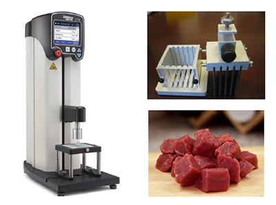 使用質(zhì)構(gòu)儀評估肉的質(zhì)地是確定肉硬度/堅實度的一種客觀方法。采用多葉片的Kramer 剪切單元,可實現(xiàn)可變幾何形狀的剪切。因此,硬度和所做的功是剪切可變形狀樣品所需力的平均值。通過在剪切單元底部的槽,這種夾具結(jié)合了壓縮、剪切和擠壓的質(zhì)構(gòu)方法。