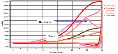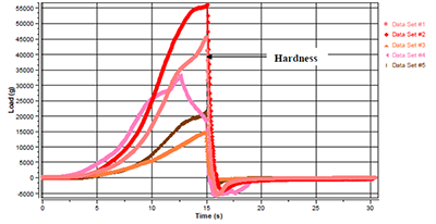• 圖2的最大峰值力是樣品硬度的量度。從測試開始到目標距離點(30毫米)的曲線下面積是所做功的度量。