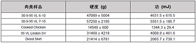 • 結(jié)果表明,30-9-95 VL 7-10批次的肉樣品硬度最高,熟雞肉樣品(Cooked Chicken)最小。這些值取自每種肉類的7個樣本。