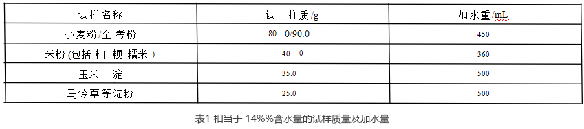 5.5.1 測(cè)力盤(pán)簧扭力矩為 68. 65 mN, m/A. U,. (700 gf· cm/A. U.)時(shí),下列谷物粉及淀粉應(yīng)稱(chēng)取含水量為 14% (基準(zhǔn)水分)的試樣的質(zhì)量(士0. 1 g)及加水量見(jiàn)表 1 。