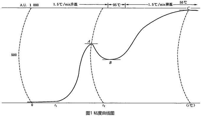將一定濃度的谷物粉或淀粉的水懸浮液,按一定升溫速率加熱,使淀粉崩化。開(kāi)始糊化后,由于淀粉吸水膨脹使懸浮液逐漸變成糊狀物 ,粘度不斷增加,隨著溫度升高,淀粉充分糊化,產(chǎn)生最高粘度值。隨后淀粉顆粒破裂,粘度下降。當(dāng)糊化物按一定降溫速率冷卻時(shí) ,糊化物膠凝,粘度值又進(jìn)一步升高,冷卻至 50℃時(shí)的粘度值即為最終粘度值。