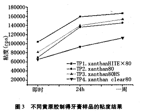 由圖 3 可知 ,不 同黃原膠制得 的牙膏樣 品粘度順序 :TPI—xanthan HITEX80> TP3 一xanthan?。福埃龋樱?TP2 一xanthan80> TP4 一xanthan?。悖欤澹幔颍福?。