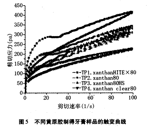 圖 6采用了控制應(yīng)力模式, 屈服應(yīng)力大小為 :TP1>TP2/TP3 > TP4。 屈 服應(yīng)力越小,在一定的剪切應(yīng)力作用下更容易流動(dòng),說明在實(shí)際生產(chǎn)中,4 一xanthan?。悖欤澹幔颍福?表現(xiàn)為樣品更容易運(yùn)輸, 洗刷分散性更好,更容易從牙膏管中擠出。