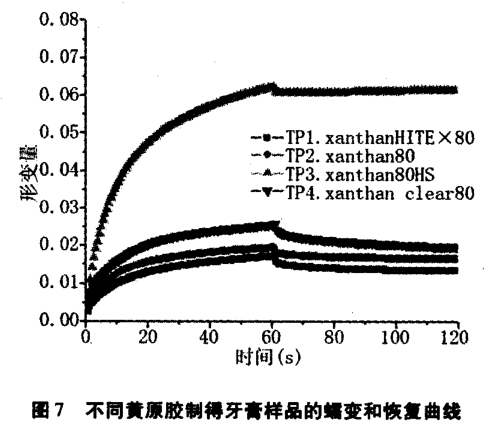 在很短的時(shí)間內(nèi)樣品顯示出瞬間很大的形變,表明膏體具有彈性,在試驗(yàn)時(shí)間內(nèi)顯示出最小 量的變形,這兩點(diǎn)揭示樣品在貯存期間內(nèi)膠水收縮作用較小,顯示了更好的穩(wěn)定性。 由圖 7 可知, 當(dāng)剪切應(yīng)力消除時(shí),四個(gè)樣品都未能恢復(fù)至原始水平。 形變量越小,則體系越穩(wěn)定, 牙膏體系穩(wěn)定性 :TP1>TP2> TP4 >一TP3。