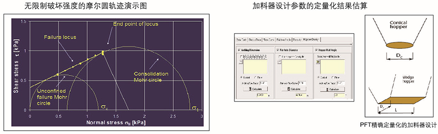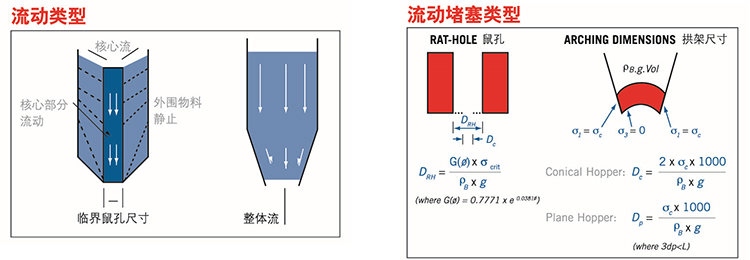 臨界拱架尺寸是整體流行為中粉體在料斗出口處可能形成穩(wěn)定的機(jī)械拱架從而阻礙流動(dòng)的一種保守計(jì)算。以上的拱架值表明料斗開口必須大于480mm(18.9in),以確保所有粉體均能穩(wěn)定流動(dòng)。2號樣品的臨界拱架尺寸比其他三種粉體的要大得多,這是由于它具有非常粘結(jié)的特性,從而更具有形成穩(wěn)定拱架的趨勢。這個(gè)計(jì)算也適用于直接輸送物料進(jìn)料斗的任何運(yùn)送設(shè)備,如螺旋供料器上凹槽的距離。