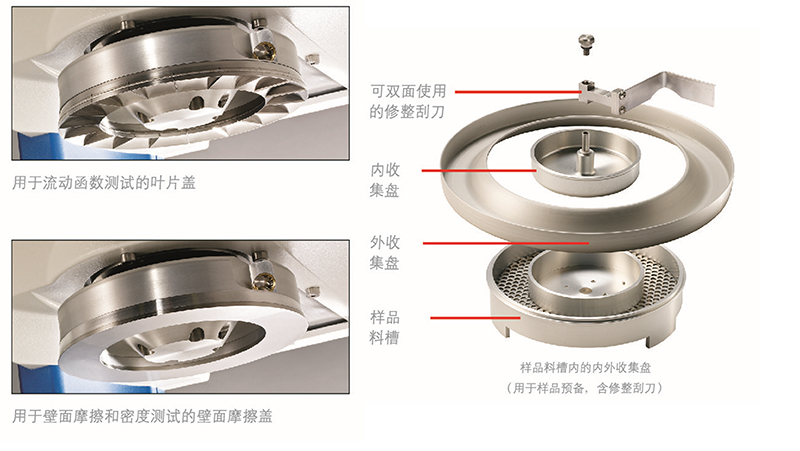 壁面摩擦蓋,軟鋼2228RA或Tvar88或特別訂購,溫度探針,濕度傳感器,篩網(wǎng)套裝標(biāo)準(zhǔn)體積或小型體積,粉體流動(dòng)演示套裝