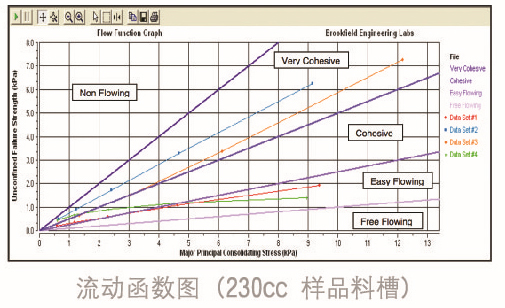 該流動(dòng)函數(shù)圖說明了在不同固結(jié)壓力下樣品的流動(dòng)能力。X軸參數(shù)為固結(jié)壓力,用來擠壓樣品;Y軸參數(shù)為粉體強(qiáng)度。2號樣品(藍(lán)色線)是全部樣品中內(nèi)聚力最大的物料,在整個(gè)固結(jié)壓力過程中均落在非常粘結(jié)( very cohesive)區(qū)間。3號樣品(橙色線)也落在了該非常粘結(jié)( very cohesive)區(qū)間。4號樣品(綠色線)在低固結(jié)壓力(1.5kPa以下)時(shí),非常粘結(jié)( very cohesive);中固結(jié)壓力時(shí)(1.5-4.5kPa),則為粘結(jié)( cohesive);而在高固結(jié)壓力(4.5kPa以上)時(shí),則容易流動(dòng)( easy flowing)。1號樣品(紅色線)在固結(jié)壓力為0-4.0kPa時(shí),表現(xiàn)為粘結(jié)( cohesive),然后在固結(jié)壓力4kPa以上時(shí),表現(xiàn)為容易流動(dòng)( easy flowing)。2號樣品清晰表明了一個(gè)切實(shí)的流動(dòng)行為是多么的困難。