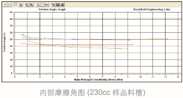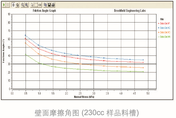 該圖說明了不同強(qiáng)度的法向應(yīng)力下的內(nèi)部摩擦角。內(nèi)部摩擦角是物料彼此滑落時(shí)粉體顆粒之間的一個(gè)摩擦測量。1號樣品和4號樣品有著最低的內(nèi)部摩擦角,因此比其他兩個(gè)樣品更容易流動(dòng)。2號樣品和3號樣品的內(nèi)部摩擦角相對較高,大約為50°,從而預(yù)示著可能會(huì)有潛在的流動(dòng)堵塞問題。