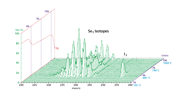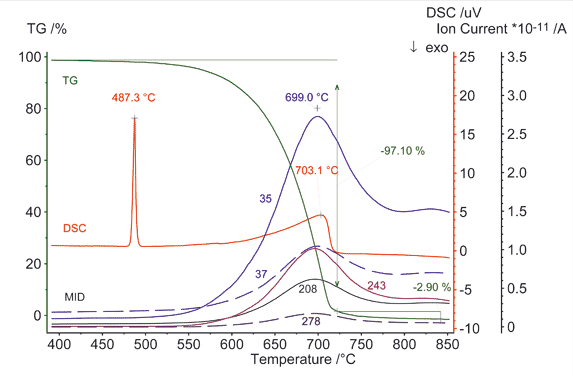 將 7.92mg 氯化鉛在 150ml/min 的氬氣氣氛中進(jìn)行升溫測(cè)試,圖中顯示了起始于熔融范圍(487°C)的揮發(fā)過程。由分裂與離子化(PbCl m/z = 243, Pb m/z = 208, Cl m/z = 37, CL m/z = 35)產(chǎn)生的分子離子(PbCl2 m/z = 278)與碎片離子能夠在遠(yuǎn)低于原料的沸點(diǎn)以下就清晰地檢測(cè)到。