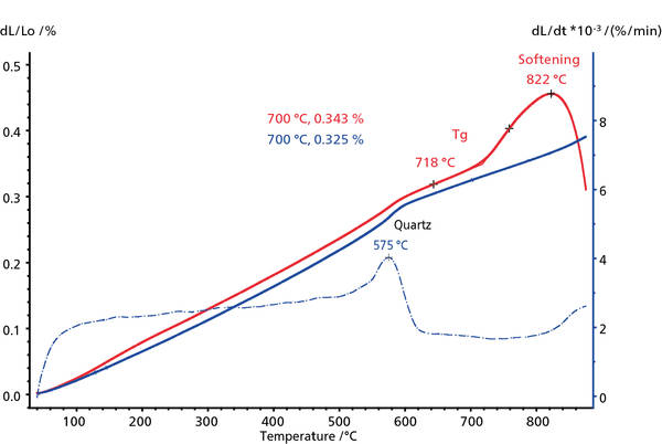 釉料與基體之間的匹配性差是造成開裂(蛛網式的裂縫布滿釉面)的主要原因。導致這種現(xiàn)象產生的重要原因之一是釉料與基體的熱膨脹不匹配。為了防止開裂,釉料的熱膨脹系數(shù)必須小于基體。下圖顯示的是基體(藍色曲線)與釉料(紅色曲線)熱膨脹行為的對比圖,在 700°C(略低于釉料的玻璃化轉變溫度 718°C)時兩者膨脹系數(shù)之間的差異為 0.02%。釉料的軟化發(fā)生在 822°C。由于釉的膨脹系數(shù)較高,將導致在冷卻過程中產生與膨脹成比例的不必要的張應力。