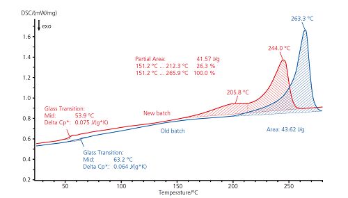 圖中顯示了看似相同的兩種顆粒的 DSC 曲線,樣品為 PA66,分別在不同時(shí)間交付(以 20K/min 的速率降溫后二次升溫)。藍(lán)色曲線(舊樣)上在 63°C 出現(xiàn)玻璃化轉(zhuǎn)變,263°C 出現(xiàn)熔融峰,均為 PA66 的典型表現(xiàn)。在新料(紅色曲線)上則出現(xiàn)了雙峰,峰值溫度為 206°C 和 244°C。這表明新料中可能存在與 PA66 共混的第二種聚合物。