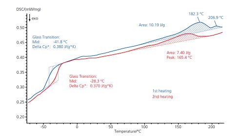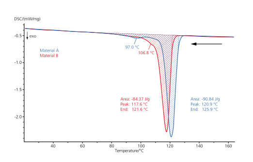 除了峰值為 121℃(藍(lán)色曲線)和 118℃(紅色曲線)的主峰外,還有 97℃ 的峰(藍(lán)色曲線)和 107℃ 的肩峰(紅色曲線),小的吸熱峰說明材料中還存在另外一種組分,材料 A 中的這一組分導(dǎo)致了較早的成核過程。