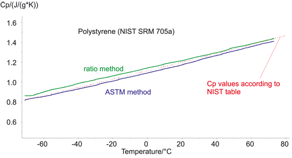 對各式各樣的材料進行比熱測試是 DSC 應(yīng)用的重要領(lǐng)域之一。圖中所示為對某種 NIST 標(biāo)準(zhǔn)物質(zhì)(NIST SRM 705a,窄分子量分布的聚苯乙烯)的比熱測試結(jié)果,升溫速率 10K/min,使用不同的分析方法進行了計算,結(jié)果表明平均誤差 < 2%。