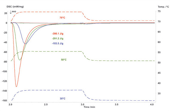 本例研究的是光照激活的環(huán)氧樹脂粘合劑的UV固化,其機理為陽離子聚合反應(yīng),反應(yīng)速率及反應(yīng)程度與溫度有較大的相關(guān)性。在60s的恒定照射時間下,較高的反應(yīng)溫度(70°C,紅色的DSC與溫度曲線)會導(dǎo)致樹脂體系的較高的反應(yīng)活性(固化更快),以及較高的反應(yīng)熱(390 J/g)。在處理雙固化樹脂體系時,不管是熱固化或是光固化,熟悉這一特性非常重要。
