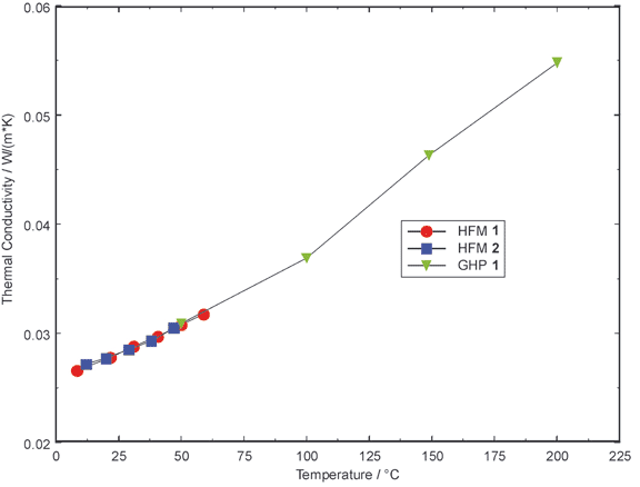 為了驗(yàn)證熱流法與其他標(biāo)準(zhǔn)導(dǎo)熱測(cè)試方法(如作為絕對(duì)法的保護(hù)熱板法 GHP)的測(cè)量結(jié)果的可比性,進(jìn)行了一系列的測(cè)試,圖中顯示了對(duì)其中一種納米多孔氣凝膠板使用兩臺(tái)熱流法導(dǎo)熱儀(HFM)與一臺(tái)保護(hù)熱板法導(dǎo)熱儀(GHP)的測(cè)量結(jié)果比較。由不同儀器獲得的數(shù)據(jù)在各對(duì)應(yīng)溫度內(nèi)偏差均小于 2.5%。這清楚地證明了 HFM 系列儀器的優(yōu)異性能。
