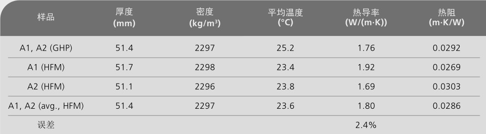 Netzsch HFM 測(cè)試較高導(dǎo)熱系數(shù)材料的關(guān)鍵是配備擴(kuò)展配件(Instrumentation kit)。下圖對(duì)三種類型的混凝土樣品進(jìn)行測(cè)試,得到的熱導(dǎo)率結(jié)果與保護(hù)熱板法(GHP)測(cè)得的熱導(dǎo)率結(jié)果十分吻合。