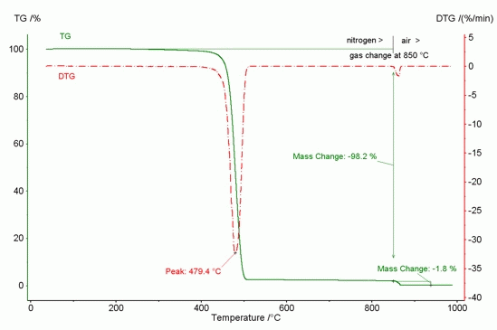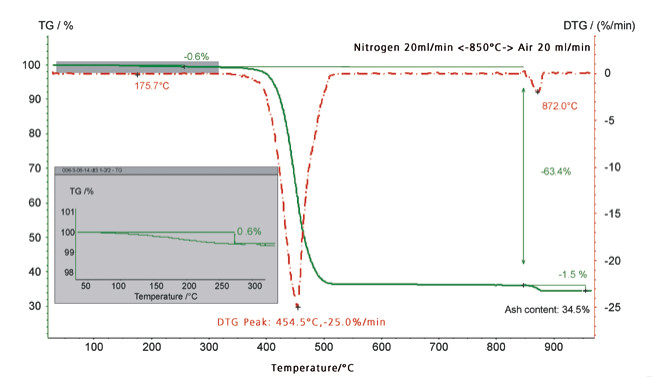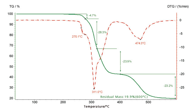 • 可對(duì)熱重曲線作一階微分(DTG)與二階微分,并可進(jìn)行峰值溫度標(biāo)注。