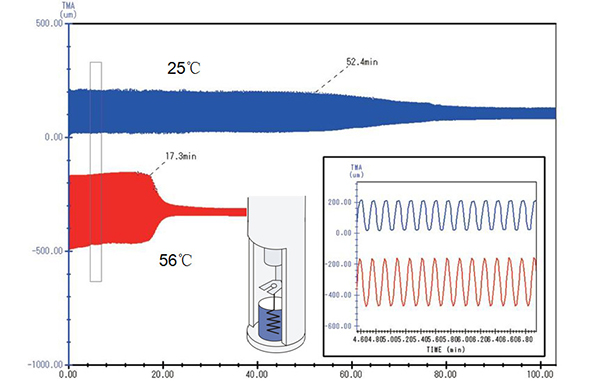 隨著溫度的上升,樣品的自然膨脹趨勢(shì)越來(lái)越大,要維持固定的壓縮形變量所需的力也相應(yīng)增大,直至自 58°C 起樣品發(fā)生玻璃化轉(zhuǎn)變之后,樣品模量下降,所需的負(fù)載力才相應(yīng)下降。