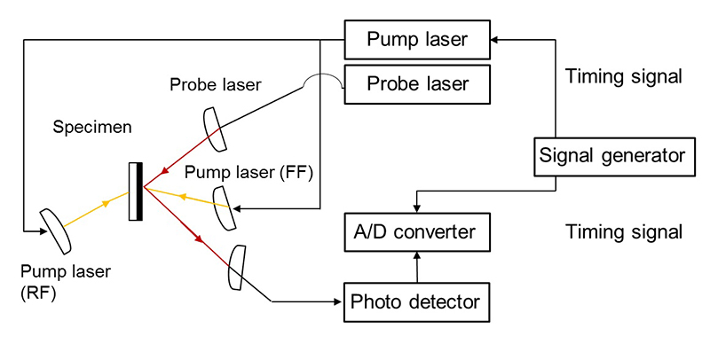 對于皮秒級熱反射分析儀 PicoTR,照射到樣品的加熱面上的是脈沖寬度僅為 0.5ps 的激光脈沖,重復(fù)周期為 50ns。使用探測激光,記錄檢測面相應(yīng)的溫度響應(yīng)。