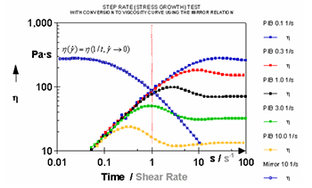 應(yīng)力階梯變化(蠕變及回復(fù))、應(yīng)變階梯變化(應(yīng)力松弛)、速率階梯變化(應(yīng)力增加/開(kāi)始流動(dòng))可以測(cè)量材料對(duì)于給定剪切應(yīng)力、剪切應(yīng)變或剪切速率的時(shí)間(瞬時(shí))響應(yīng)。分析方法包括計(jì)算一些重要的材料參數(shù),如零剪切粘度、平臺(tái)模量、蠕變?nèi)崃亢蛯⑺矐B(tài)材料函數(shù)轉(zhuǎn)換為動(dòng)態(tài)材料函數(shù)- G’(ω)G”(ω)。圖六中,提供了應(yīng)力增加測(cè)試實(shí)例。