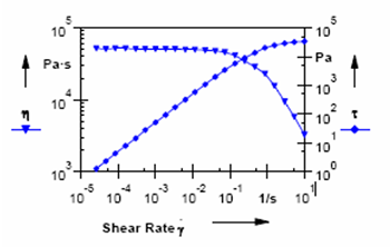聚合物的流動(dòng)曲線一般以第一牛頓平臺(tái)區(qū)的低剪切速率下的粘度作為零剪切粘度,隨剪切速率增大,粘度會(huì)下降,產(chǎn)生一個(gè)轉(zhuǎn)變區(qū)間。在高的剪切速率下,粘度曲線的斜率即粘度對(duì)剪切速率的曲線斜率是恒定的,即符合所謂的冪律方程。在更高的剪切速率下,粘度又會(huì)出現(xiàn)第二牛頓平臺(tái)區(qū)。然而,實(shí)現(xiàn)真正應(yīng)變控制的旋轉(zhuǎn)流變儀大多數(shù)情況下可以做到第一牛頓平臺(tái)區(qū),轉(zhuǎn)變區(qū)和冪律區(qū)。