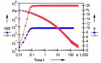 在這個(gè)實(shí)驗(yàn)中,施加一個(gè)恒定的應(yīng)變 Ý,測(cè)量應(yīng)力隨時(shí)間的變化曲線,通常用松弛模量 G(t)=ζ(t)/γ來(lái)表示。從圖 4 中可以看出,配置同步電子整流馬達(dá)(EC 馬達(dá))的流變儀可以在 100ms內(nèi)達(dá)到設(shè)定應(yīng)變,并且無(wú)過(guò)沖。兩個(gè)設(shè)定不同應(yīng)變的數(shù)據(jù)吻合的很好,也證明了所選應(yīng)變?cè)诰€性粘彈區(qū)內(nèi)。