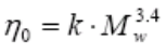 在低剪切或低角頻率下區(qū)域,聚合物的粘度與剪切速率或角頻率無(wú)關(guān),即存在零剪切粘度。零剪切粘度是一個(gè)重要的材料參數(shù),直接和平均分子量 Mw的 3.4 次方成正比。