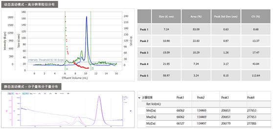 BeNano動(dòng)靜態(tài)流動(dòng)模式(Flow Mode)是將納米粒度及Zeta電位儀同一個(gè)分離前端(FFF、GPC/SEC)相連接。分離前端可以根據(jù)尺寸將樣品進(jìn)行分離,依次流出。通過(guò)檢測(cè)每個(gè)流出組分的動(dòng)態(tài)光散射信號(hào)和靜態(tài)光散射號(hào),并結(jié)合分離前端的示差折光RI或者紫外UV信號(hào),得到高分辨率且不依賴于計(jì)算模型的粒徑分布、分子量分布信息。