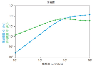 改變振蕩頻率可表征不同時(shí)間尺度下的黏彈性。液體肥皂在靜止時(shí)表現(xiàn)出類似流體的行為(G">G',但在極短的時(shí)間尺度內(nèi),彈性行為占主導(dǎo)地位(G'>G”)。這會(huì)影響消費(fèi)者的體驗(yàn),只能使用振蕩流變學(xué)對(duì)此進(jìn)行量化。