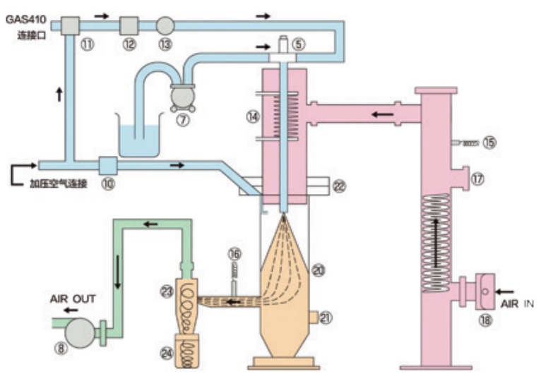 送液軟管(硅膠帶止動塊2根、TYLON帶止動塊3根)、排氣軟管(帶1 個軟管扎帶)1根、出口溫度傳感器、保險絲(250V 2A)去靜電線、進氣軟管5m(帶2個軟管扎帶)、GF300噴霧組件 |